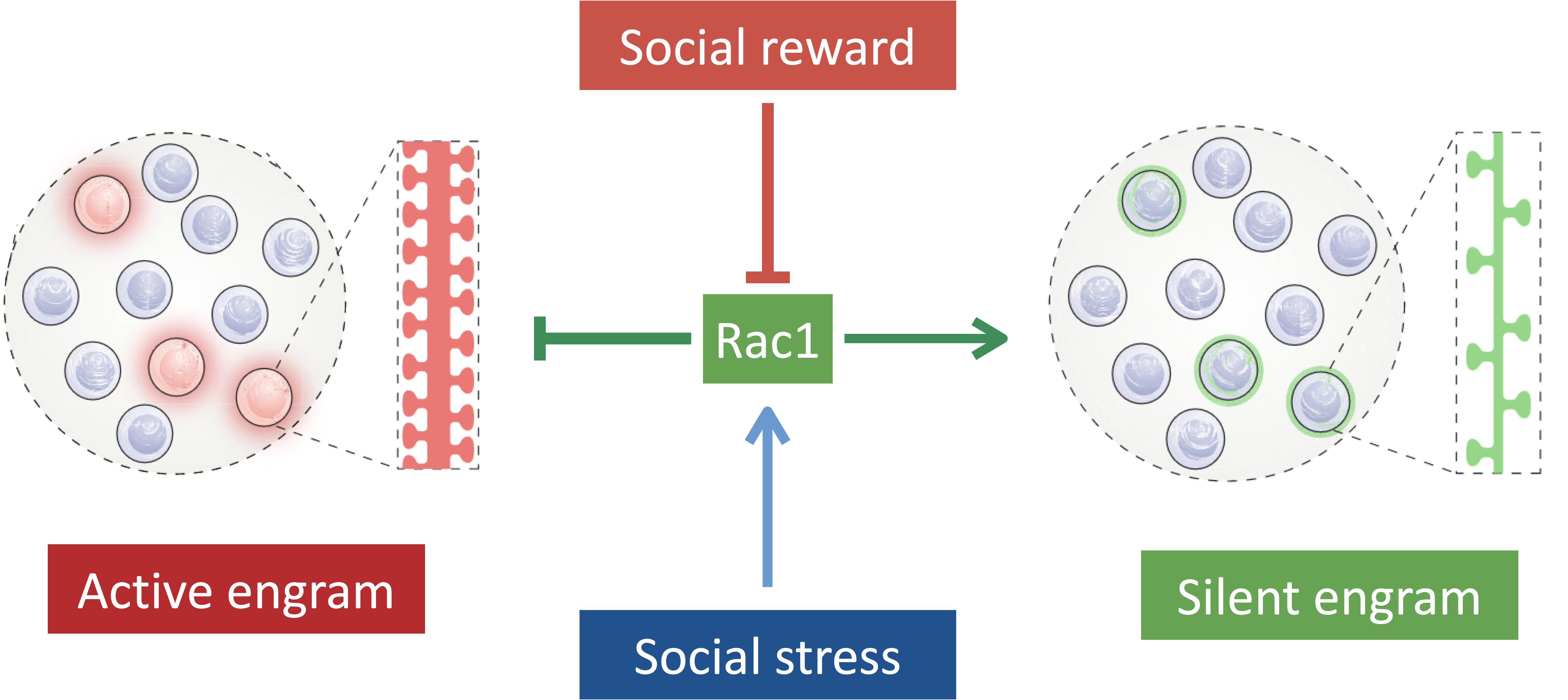 近日,beat365英国官方网站生命科学学院钟毅教授课题组揭示了Rac1-依赖的遗忘机制是情绪状态影响记忆表达的神经基础。在该研究中,课题组聚焦海马体CA1区的记忆痕迹细胞与情绪状态的关系,发现了社交经历引发的情绪可以双向调节记忆痕迹的存储状态,如社交奖励可以将记忆痕迹由沉默态转换为潜伏态,而社交压力可以将记忆痕迹由潜伏态转换为静默态。通过对海马Rac1活性的检测与操纵,我们证明了社交奖励通过抑制海马Rac1、社交压力通过激活海马Rac1来实现记忆痕迹在不同状态之间的转换。如图1所示,该研究提供了一个全新的神经生物学机制来帮助我们理解日常的情绪变化是如何通过切换海马体中的记忆痕迹状态来根据环境变化灵活调节记忆提取的。