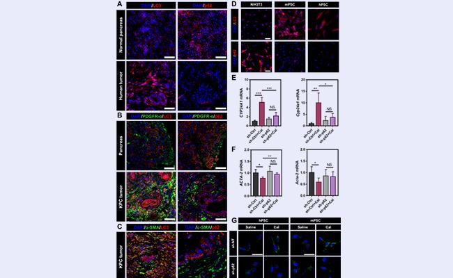 将活化的PSC“重塑/正常化/去活化”为静息状态,是改变PDAC抑制性肿瘤微环境的重要途经。为探索高效的PSC重塑策略,该研究首先对PSC活化过程中的生物学现象进行了分析。研究发现,肿瘤组织中活化的PSC具有显著上调的自噬水平并伴随有p62蛋白的下调(图2A-D)。为更好地探索自噬、p62和VDR信号通路在PSC活化中的关系,该研究构建了p62敲低的PSC,发现在p62敲低的PSC中,VDR配体Cal无法激活VDR信号通路(图2E),p62的丢失也抑制了Cal去活化PSC的能力(图2F-G),说明了PSC中上调的自噬和与之相伴的p62丢失是造成PSC对VDR配体不敏感的重要原因。该部分是研究的生物学基础,基于上述的生物学发现,该研究提出了协同自噬抑制和VDR信号通路激活的PSC重塑策略。