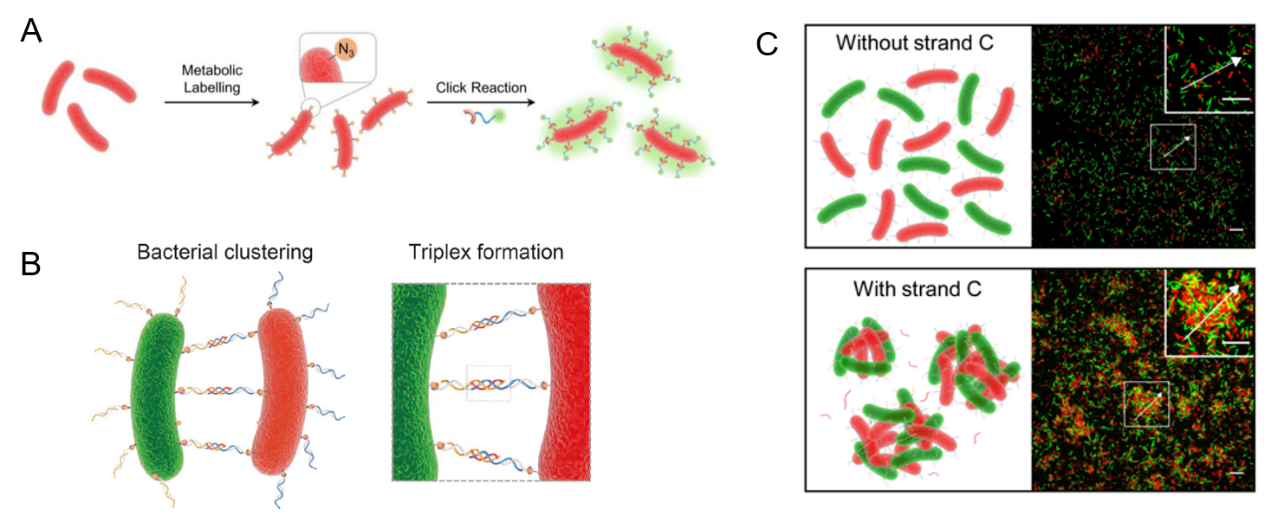 图4. DNA三螺旋介导的细菌组装过程。(A)通过代谢标记和点击化学的方式在细菌表面标记DNA。(B)三螺旋介导的细菌自组装示意图。(C)三螺旋介导的细菌自组装共聚焦显微镜图像结果