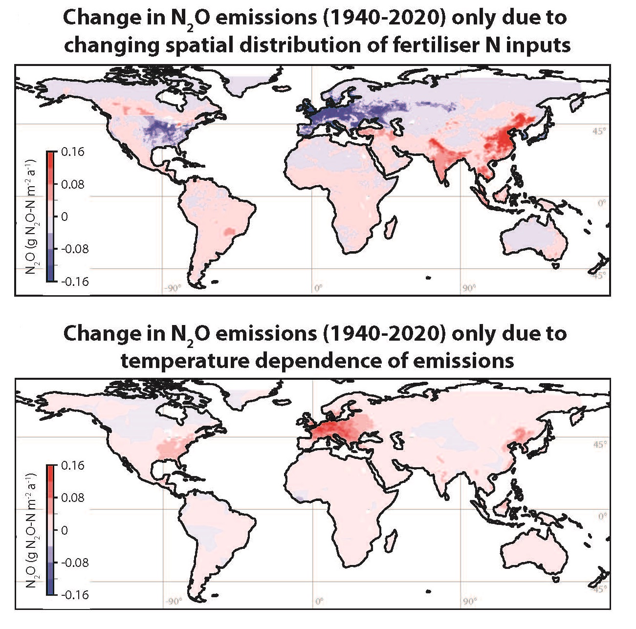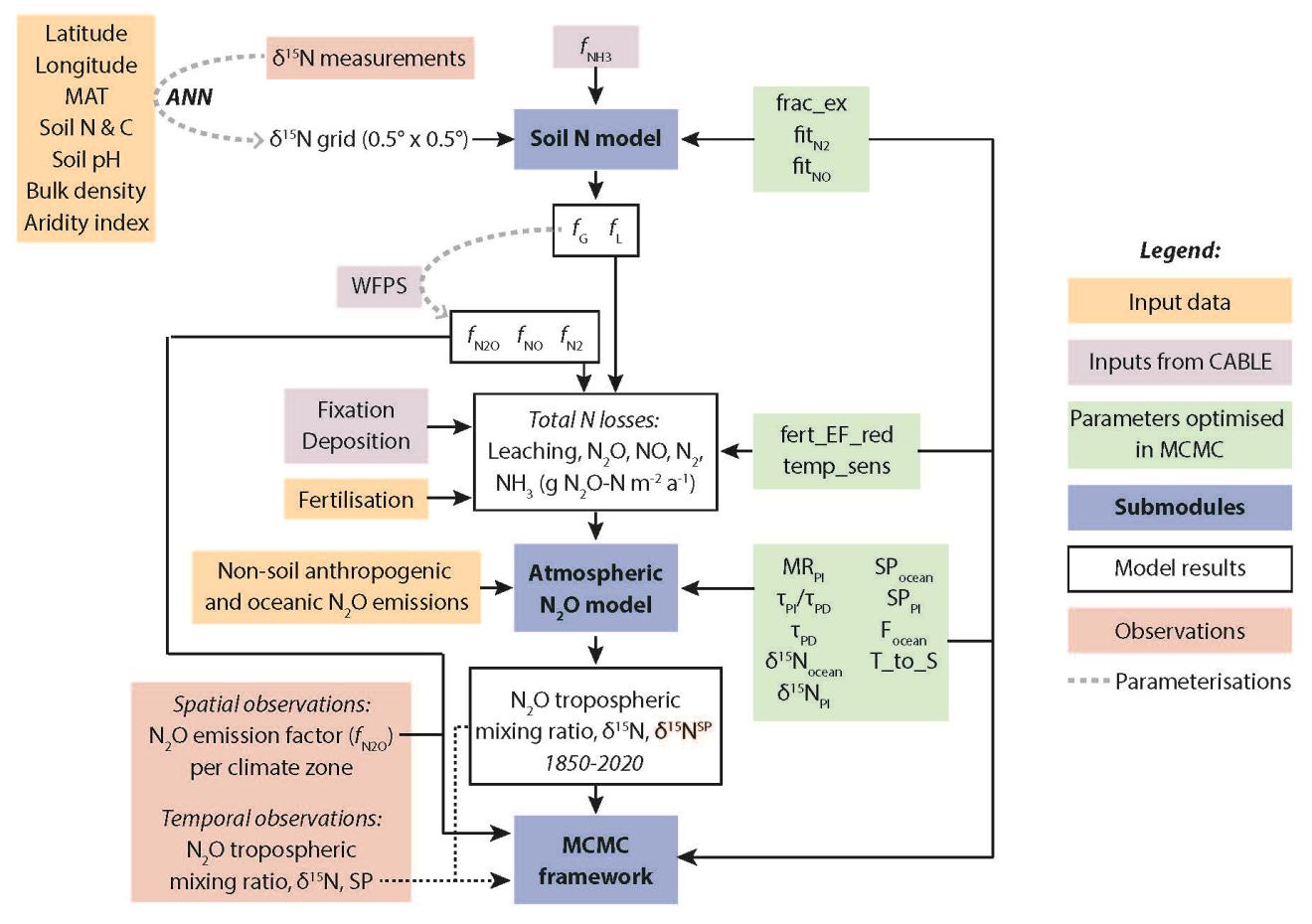 结合上述问题,beat365英国官方网站深圳国际研究生院余龙飞课题组与瑞士苏黎世联邦理工学院Eliza Harris课题组展开了密切合作,开发了一套土壤-大气氮同位素耦合过程模型(IsotopicTracingOfNitrogen in theEnvironment-IsoTONE),以评估全球尺度下N2O排放的时空分布规律。该模型以全球土壤δ15N丰度分布为基础,模拟土壤氮损失和N2O排放过程,并利用大气背景下N2O同位素的长期观测数据加以验证,来计算N2O排放系数的全球分布特征,以及在1940-2020年间的变化趋势。