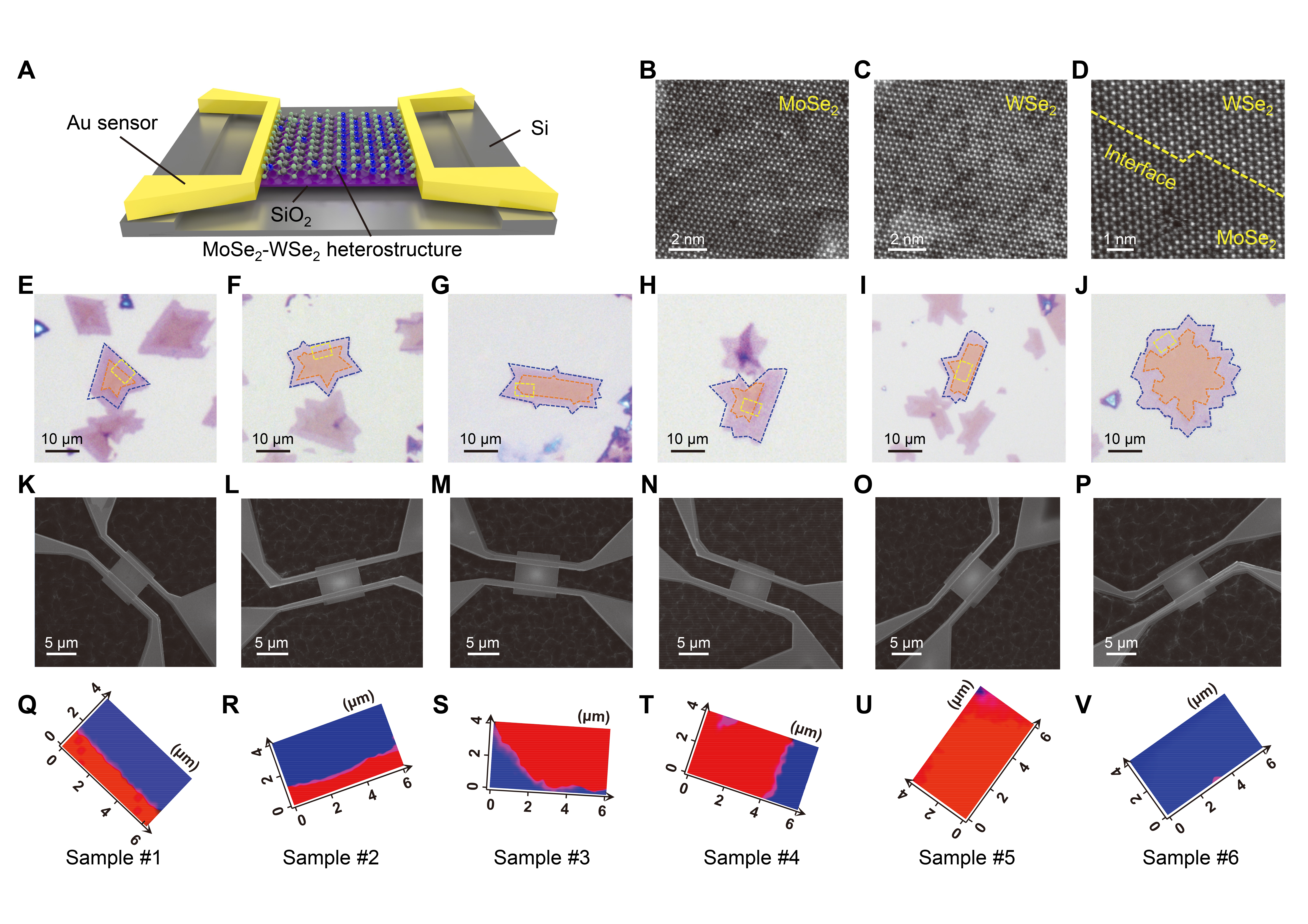为了解决上述难题,研究团队采用常压化学气相沉积(Atmospheric-Pressure Chemical Vapor Deposition, AP-CVD)方法合成了单层MoSe2-WSe2面内异质结,采用高精度纳米定位和电子束曝光加工技术制备得到了具有不同界面转角的悬架H型电子器件,使用高角环形暗场扫描透射电子显微镜(HAADF-STEM)和拉曼光谱扫描方法精确表征了异质结界面的原子结构、形貌、位置和角度(图1)。