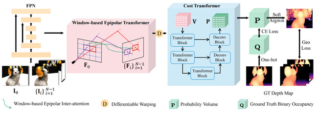 该论文基于CasMVSNet优化,使用window-based Transformers提高特征匹配和全局特征聚合的质量,同时加入几何一致性损失函数在不同视角下约束深度图的生成。WT-MVSNet将多视图立体视觉的本质看成特征匹配任务,提出WET对参考特征图与对应源视角下极线附近区域进行特征匹配,聚合特征图内和特征图间的信息。随着感受野的增大,正则化网络得到的深度图质量会更好,提出CT将3D window-based Transformer代替3D UNet结构使得估计得到的深度图更加平滑、噪声更少。最后设计了几何一致性损失函数,从不同视角对估计的深度图进行监督,惩罚深度图中不符合几何一致性的像素。WT-MVSNet在DTU和Tanks and Temples Benchmark上都取得了最先进的重建效果。