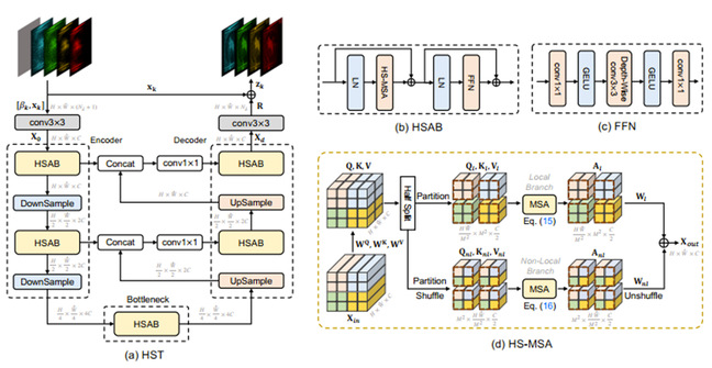 本论文提出了首个深度展开式的Transformer用于单曝光压缩成像重建。如图5,首先我们推导出一个能够感知快照压缩成像退化模式的框架。从快照估计图和编码掩膜中估计出退化信息参数。为更好地捕获局部表征和长程依赖关系,作者设计了一种半混叠式的Transformer。如图6,它有两个分枝,一个在局部窗口计算自相似,另一个先通过窗口间的混叠,再计算自相似。该方法比以往方法高出4dB。