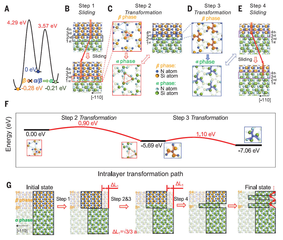 研究团队通过第一性原理计算在原子层级揭示了β→α相变机制,原子尺度的滑动以及随后[NSi3]单元旋转和界面上的结构畸变导致了相变的发生(图5)。α和β之间的共格界面有利于断键后原子的再结合,这促进了键的转换,而不会引发传统断键过程中总是出现的裂纹。而由键转换产生的连续原子重排的积累导致了应力诱导β→α相变和随后的塑性变形能力。