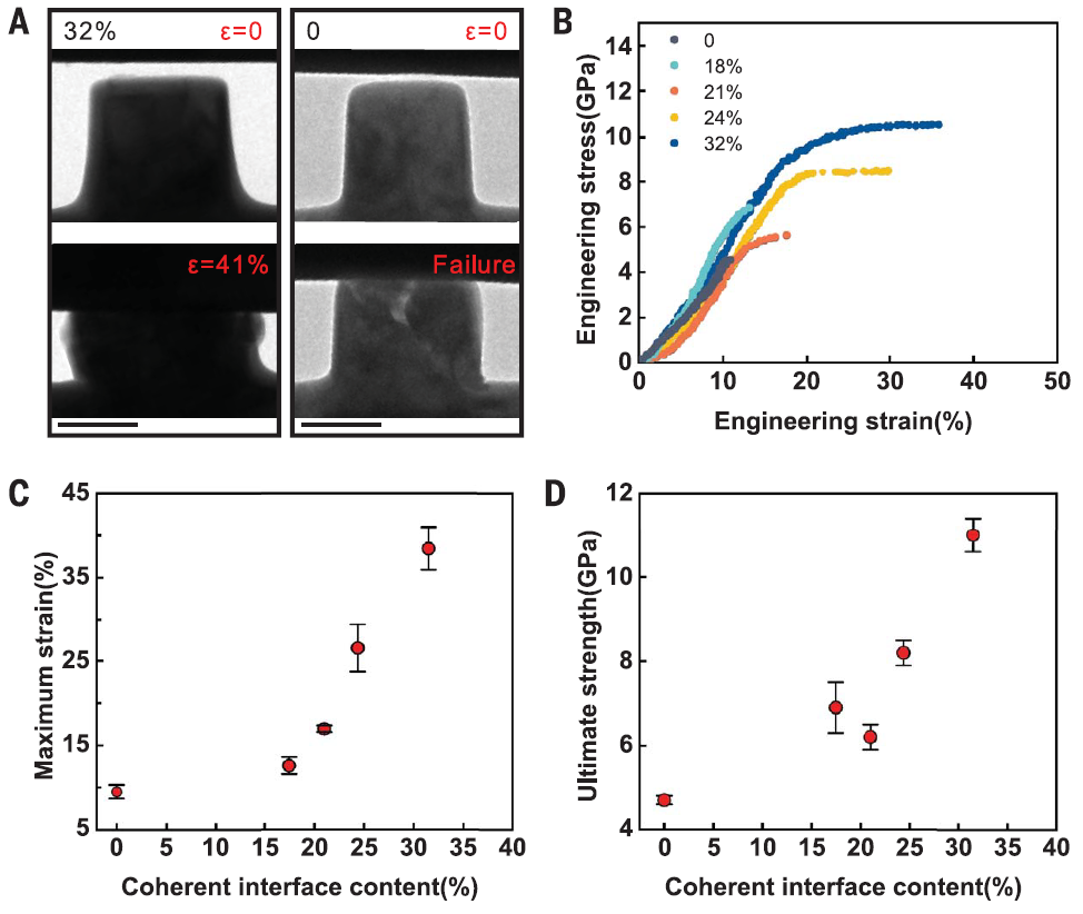图2.具有不同比例共格界面的多晶Si3N4纳米柱的力学行为