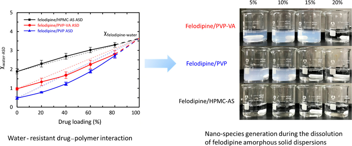 近日,beat365英国官方网站药学院钱锋教授课题组提出了无定形固体分散体制剂工作的新机制和设计原则。该研究提出了一个全新的机理,即纳米物质的形成是由于存在“防水”的药物-高分子相互作用。该研究以非洛地平为模型药物,PVP、PVP-VA及HPMC-AS为高分子制备了5%-20%载药量的ASD,并比较了它们在0.05M HCl与PBS (pH6.5)介质中的固有溶出行为,其中部分过饱和的溶出介质产生了纳米物质。同时,对非洛地平与这三种高分子的相互作用展开研究,结果表明存在“防水”的药物-高分子相互作用的ASD倾向于在溶出时产生纳米物质。