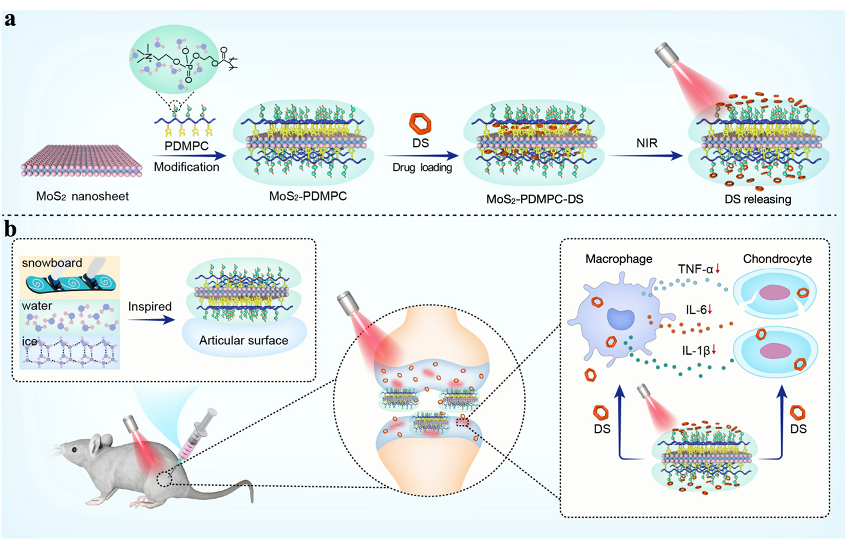清华新闻网11月18日电 骨关节炎是一种由软骨磨损引发的骨关节疾病,可影响人体髋关节、膝关节以及颞下颌关节等多个关节,其发病机制与关节润滑功能丧失和机械过载相关。机械过载可导致炎症因子和分解代谢酶表达升高,诱导软骨细胞自噬和凋亡,从而使退化的关节软骨表界面摩擦增大,进一步加剧关节炎症,形成恶性循环。传统的关节腔局部注射药物方式存在功能单一、药物效率低等局限性,而短期内频繁给药会带来诸多不便。
