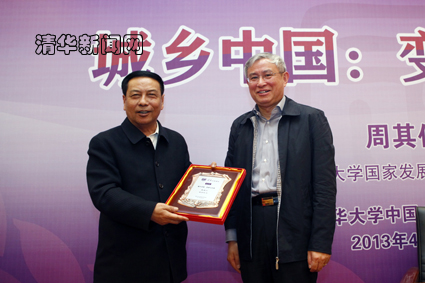 图为陈锡文为周其仁颁发“清华三农讲坛”纪念证书。