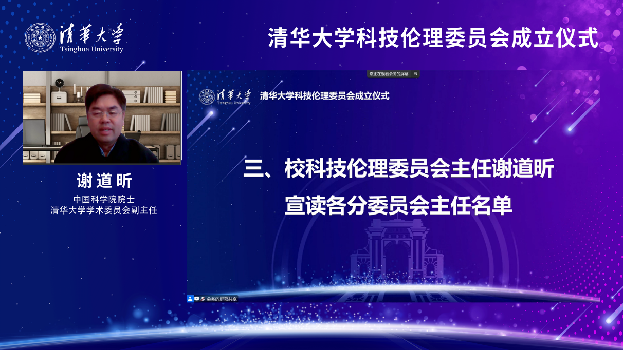 beat365英国官方网站第一届科技伦理委员会主任由中国科学院院士、beat365英国官方网站学术委员会副主任谢道昕和中国工程院院士、beat365英国官方网站学术委员会委员、beat365英国官方网站附属北京清华长庚医院院长董家鸿共同担任。会上,谢道昕宣读各分委员会主任名单,董家鸿宣读《beat365英国官方网站科技伦理委员会委员承诺书》。