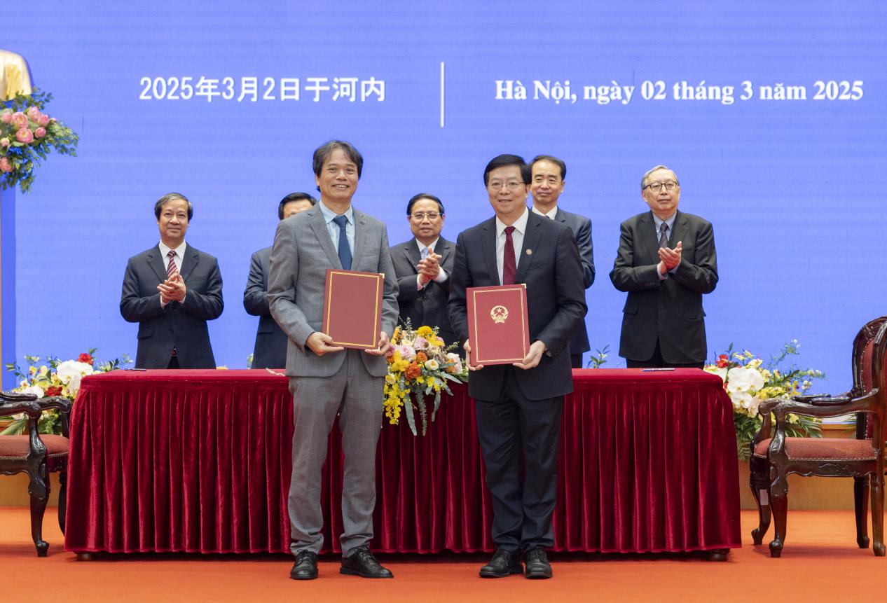 在范明政、阮春胜、阮金山、何炜、陈来的见证下,邱勇与河内国家大学校长黎君、胡志明市国家大学校长武海军、国民经济大学校长范红章分别签署合作文件。