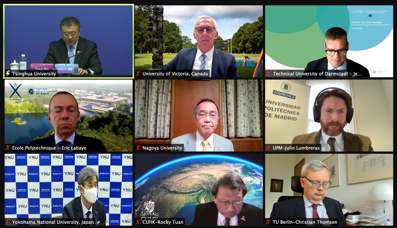 围绕“碳中和科学研究和人才培养”这一议题,滑铁卢大学校长斐丹·汉杜拉普(Feridun Hamdullahpur)指出,应对气候变化亟需全球高校的智慧和力量,倡议在技术、公共政策、公众教育等方向共同发力、寻找解决方案。北海道大学校长宝金清博(Kiyohiro Houkin)介绍了该校在校园减碳实践和可持续发展规划等方面做出的努力,强调为实现2050年联合国可持续发展和碳中和目标离不开世界大学间的通力合作。名古屋大学校长松尾清一(Seiichi Matsuo)提出大学在推动企业和政府间合作网络构建中的作用,呼吁建立全球性的伙伴关系。马德里理工大学副校长胡里奥·卢布雷拉斯(Julio Lumbreras)认为,可以将大学校园里的碳中和策略与原则应用到城市中去,促进城市的变革。维多利亚大学校长凯文·霍尔(Kevin Hall)指出,青年学生在不断寻求与自然共生、探索人类可持续发展的实践中扮演着重要的角色。冰岛大学校长乔恩·阿特利·本内迪克森(Jon Atli Benediktsson)强调,要重视人才培养,系统部署科研教学工作,培养强大的研究团队。
