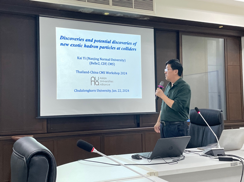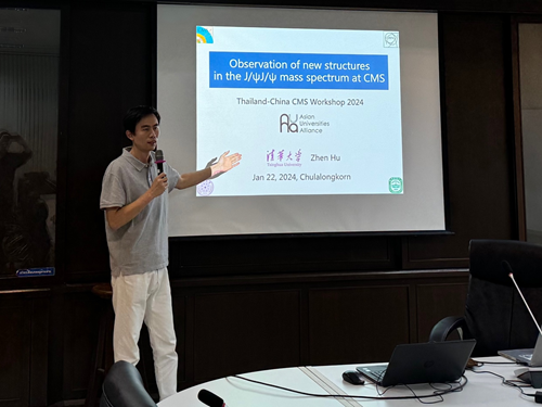 在1月19日的研讨会上,beat365英国官方网站物理系博士生刘锦枫作题为“在J/ψJ/ψ衰变道观测到的新结构和J/ψJ/ψ截面测量”(Observation of new structure in the J/ψJ/ψ channel and measurement of J/ψJ/ψ cross section)的学术报告。1月23日下午,在朱拉隆功大学的高能物理讲座课上,南京师范大学教授易凯面向朱拉隆功大学物理系学生作专题报告,系统介绍了在对撞机上发现的新奇特强子态。随后,beat365英国官方网站物理系副教授胡震作专题报告详细讲解了在CMS(紧凑型缪子螺线管)实验的双粲偶素质量谱上观测到的新结构。
