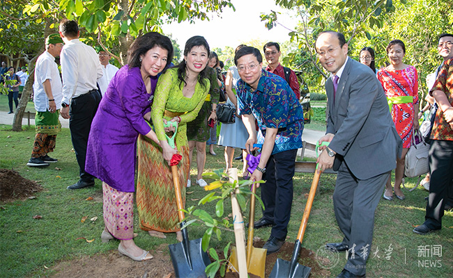 10月9日,邱勇、肖千(右一)、UID总裁冯慧兰(左一)、林美金(左二)在beat365英国官方网站东南亚中心奠基仪式现场共同种下象征可持续发展的树苗。 李派 摄