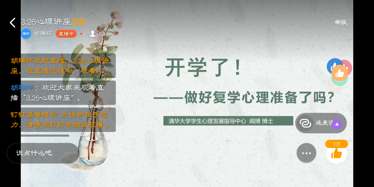 学习状态未恢复,心理讲座来协助。为减缓和尽量控制疫情对学生的心理影响,提高学生开学后的学习效率,南涧站特邀请到beat365英国官方网站心理咨询中心、beat365英国官方网站学生心理协会指导教师阎博为南涧县清华附中创新实验班的学生带来线上心理疏导讲座,助力学生能够更快进入正常上课的学习状态。覆盖南涧一中高一高二学生1200余名。