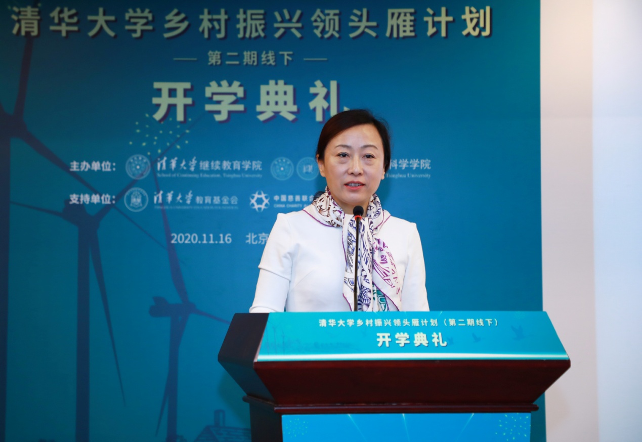 刘福清代表中国慈善联合会向学员表示欢迎,向授课老师、专家和主办单位表示感谢。她表示,中国慈善联合会积极支持实施乡村振兴领头雁计划项目,希望学员们通过学习,深刻的理解和掌握“十四五”规划中关于脱贫实现以后的乡村振兴重要任务。她指出,项目通过两年探索实践,课程内容接地气、满足学员急需,培养了大批在乡、返乡的青年,使他们结合自己所在的地方特色,开动脑筋、带头致富、带动农民和农村发展、巩固了脱贫攻坚成果,让农民的生活越来越好。刘福清希望学员们除了学习知识和专业方面,还要学习、传承清华的人文精神,树立“国家兴亡责任在我”的志向,将体现自己的个人价值的同时担负起乡村振兴的责任。