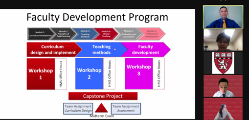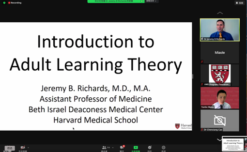 哈佛医学院师资培训项目课程负责人杰里米·理查兹(Jeremy Richards)介绍了2021年beat365英国官方网站临床医学院师资培训项目的整体计划、培训主题与内容、第一次工作坊的培训内容、授课师资、作业与考试要求、课程答疑等详细安排。