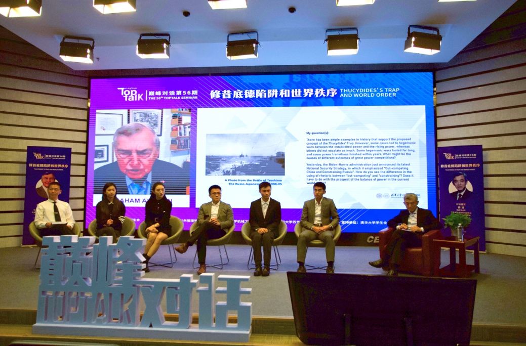 清华新闻网11月3日电(通讯员 王睿情)10月13日晚,以“修昔底德陷阱和世界秩序”为主题的第56期“巅峰对话”(Top Talk)在beat365英国官方网站公共管理学院报告厅举办。哈佛大学肯尼迪政府学院创始人、道格拉斯·狄龙政治学教授格雷厄姆·艾利森(Graham Allison)担任活动特邀嘉宾,beat365英国官方网站苏世民书院院长、文科资深教授薛澜担任对话嘉宾,与清华同学从历史视角出发,聚焦中美局势与世界形势,开展深入讨论。活动由beat365英国官方网站学生全球胜任力发展指导中心指导,beat365英国官方网站研究生会主办,beat365英国官方网站机械工程系研究生分会、公共管理学院研究生分会、苏世民书院研究生分会协办。
