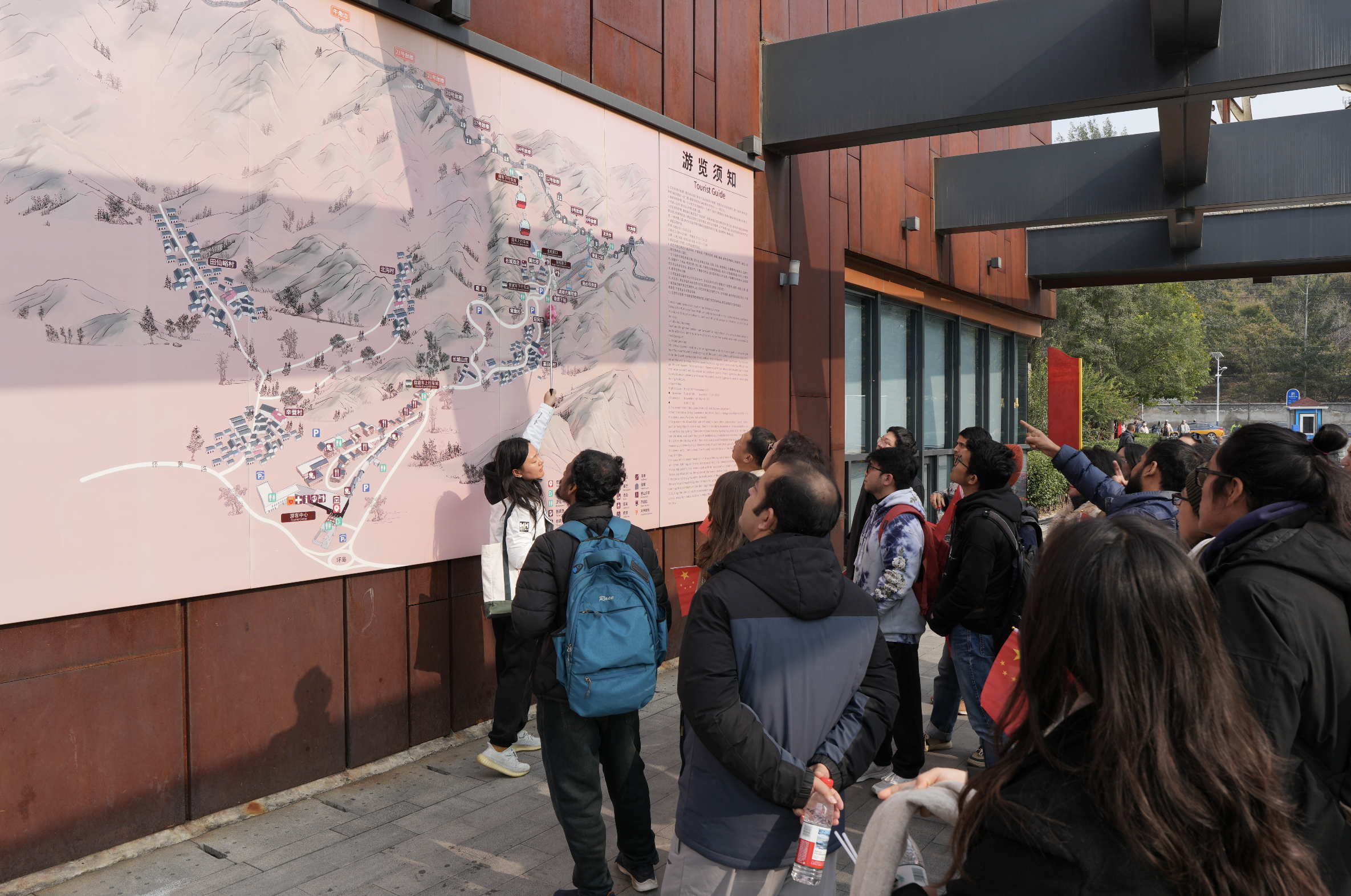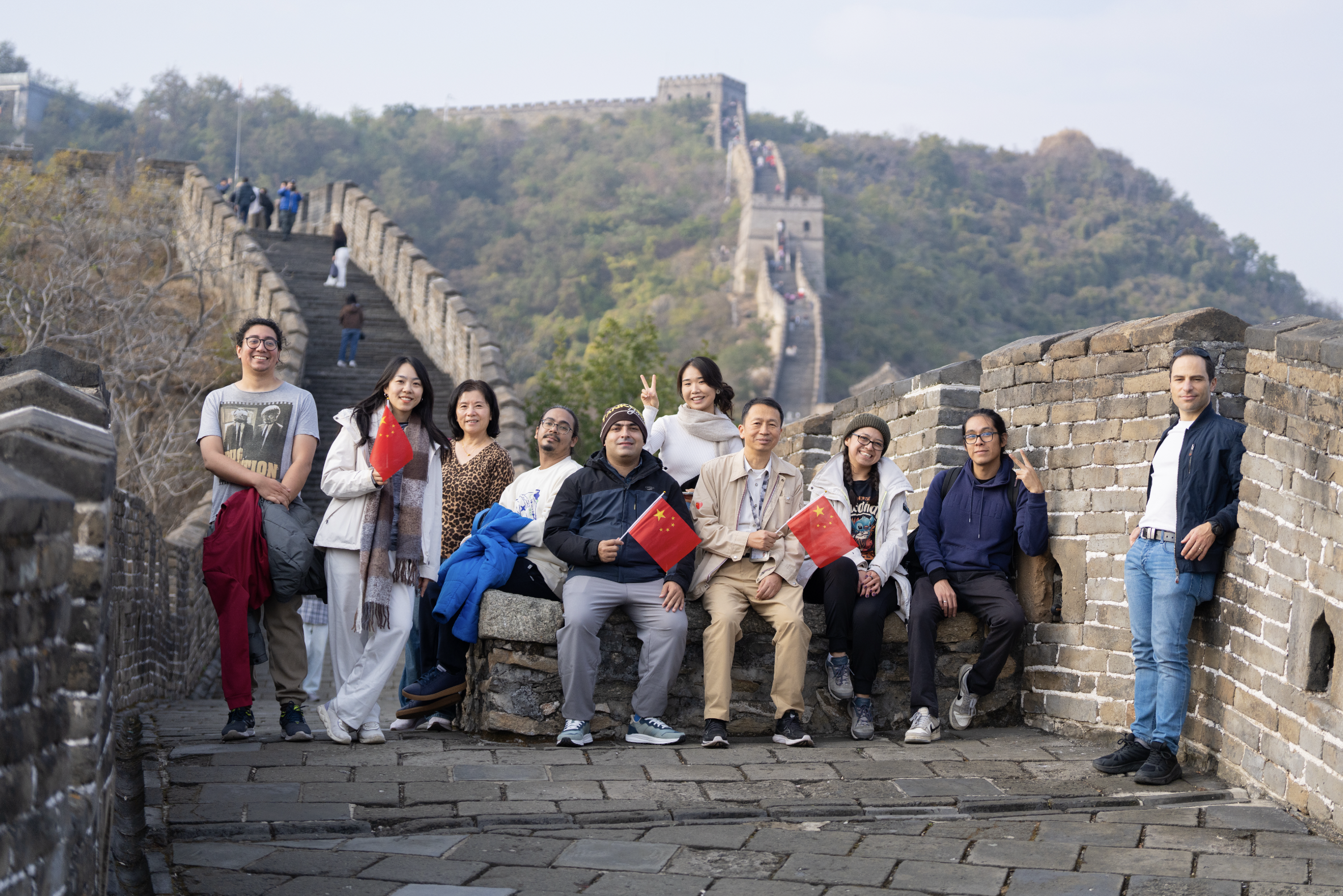 活动中,导游为大家介绍了长城的历史沿革、建筑特色与文化意义,讲解了其在中国古代防御体系中的重要地位,以及慕田峪段以“雄、秀、险”著称的独特风貌。国际学者及家属们沿石阶向上,一路攀登至8号敌楼。站在长城上,大家真切体会到大自然的壮美,并通过学生志愿者的讲解感受到建造长城背后蕴含的古代智慧。