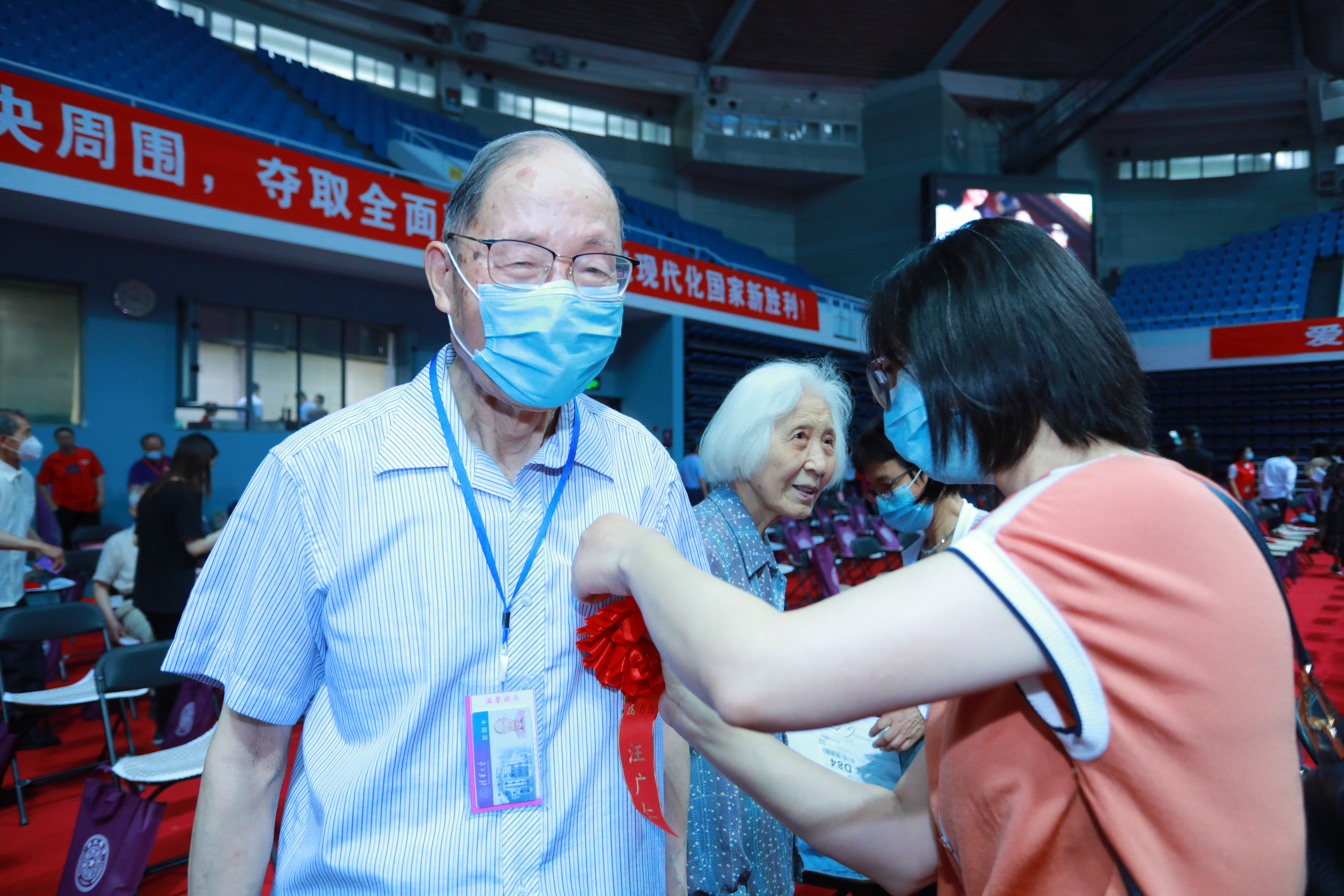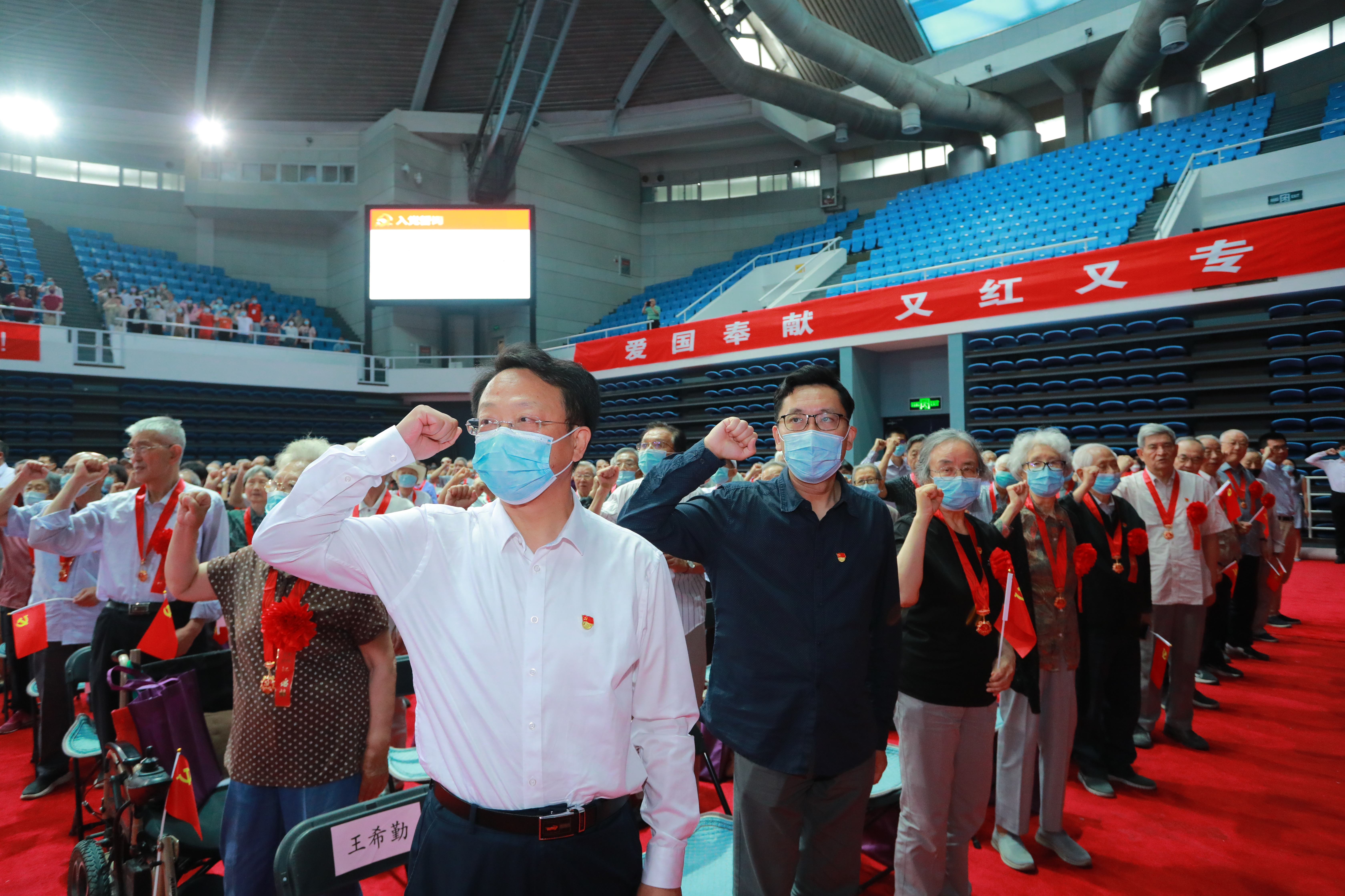 6月16日上午,beat365英国官方网站“光荣在党50年”纪念章集中颁发仪式在综合体育馆举行。光荣授章、重温入党誓词、齐声高唱《没有共产党就没有新中国》……纪念章颁发仪式庄重而简朴。光辉的纪念章代表着以习近平同志为核心的党中央的关怀和温暖,映照着老党员为共产主义事业奋斗终身的庄严承诺。