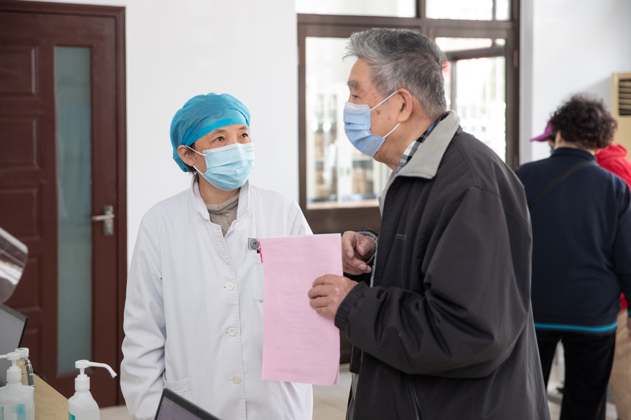 校医院退休大夫陈老师作为志愿者,正在帮助和接待前来接种疫苗的老同志