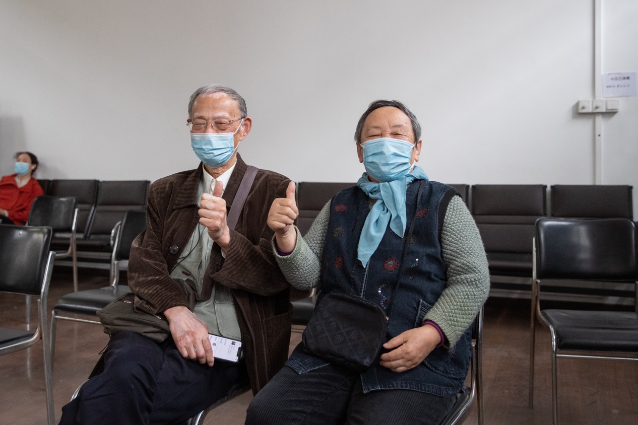 留观时间结束后,老同志在志愿者的引导下离开,完成疫苗接种