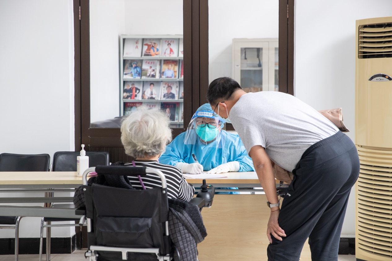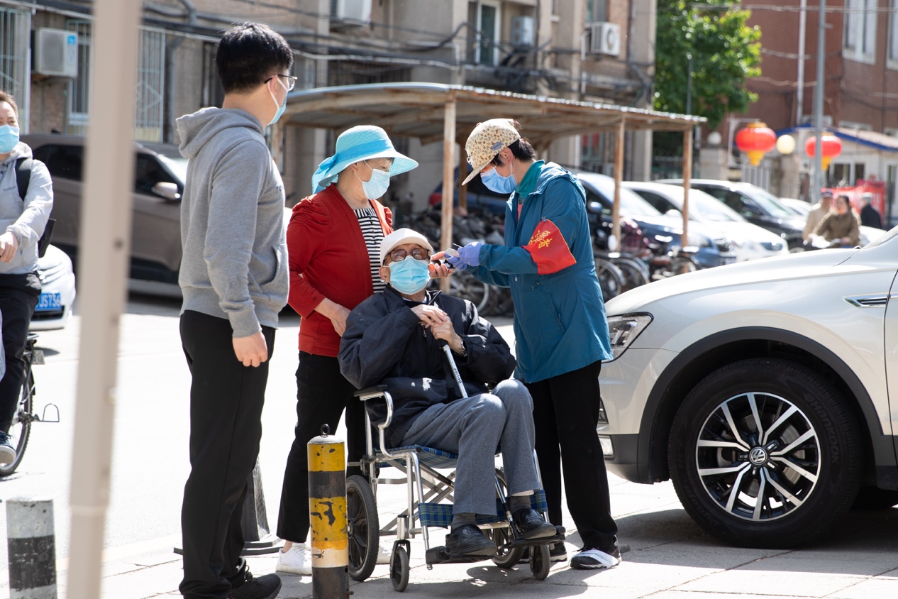 疫苗接种前,志愿者为老同志测量血压