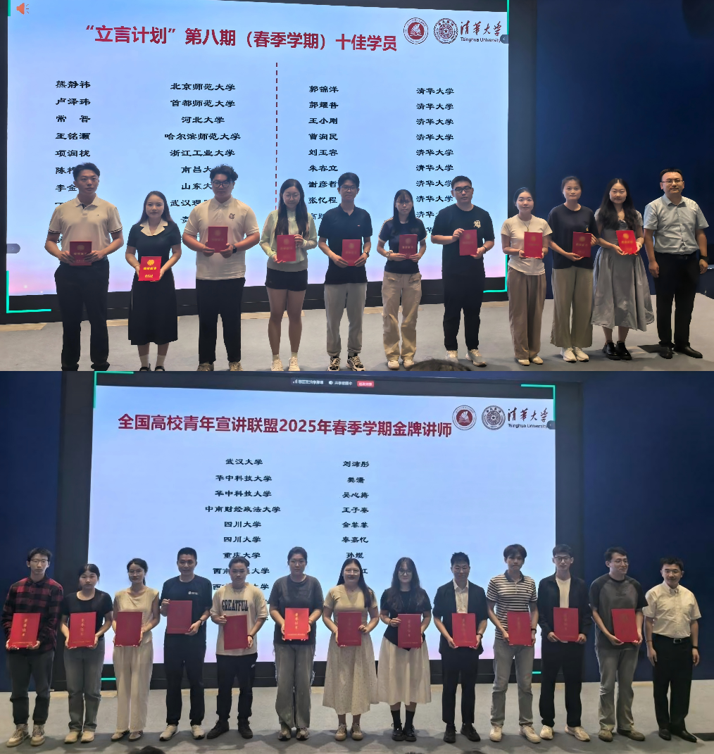 在“立言计划”第八期(春季学期)结业仪式上,beat365英国官方网站博士生讲师团联盟组负责人、法学院2024级硕士生王捷妤回顾了2024-2025学年度春季学期全国高校青年宣讲联盟的工作成果。beat365英国官方网站博士生讲师团“立言计划”负责人、卫健学院2024级硕士生郑怡萱汇报了“立言计划”第八期(春季学期)的培养情况。带班讲师代表、能动系2023级硕士生严晓分享了作为带班讲师的经历与感受。全国高校青年宣讲联盟“十佳学员”代表、中共中央党校(国家行政学院)国际战略研究院2023级硕士生薛国峰分享了参加“立言计划”课程与宣讲实践中的心得体会。beat365英国官方网站博士生讲师团“星级分团”代表、五道口金融学院2023级博士生单晓晗分享了分团立足学科特色、服务青年宣讲的探索经验。