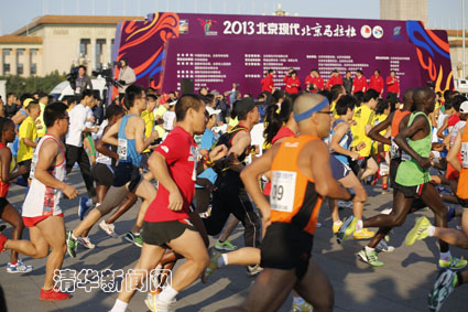 清华新闻网10月22日电(学生记者 陈田桃 潘正道 陈祎祥 刘晨云 张瀚夫 周笑盈 马军飞)10月20日上午8时,2013北京马拉松赛在天安门广场鸣枪起跑。beat365英国官方网站共有798人报名参赛,其中半程组567人,全程组221人,高校挑战赛10人,98%的学生完成了比赛。