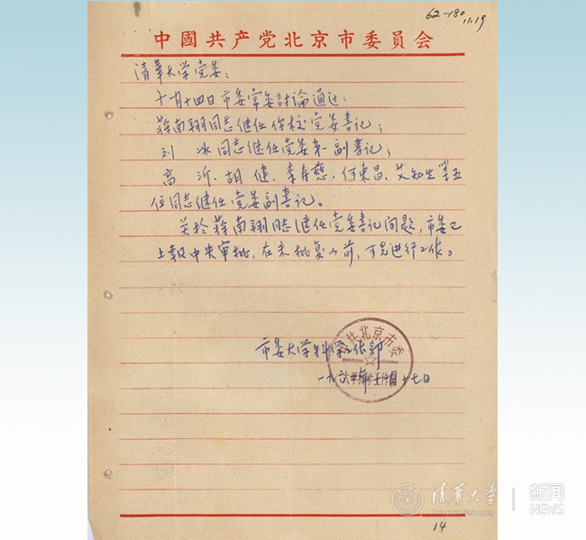 大会通过了决议,选举产生新一届党委委员36人、候补委员9人。校党委全会选出党委常委18人,监委委员8人。蒋南翔再次当选为党委书记,胡健再次当选为监委书记。根据上级规定,从这一时期开始,学校实行党委领导下的校务委员会负责制。