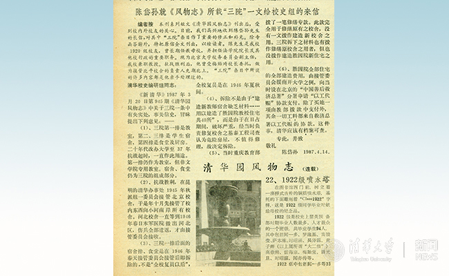 1987年,《新清华》开辟“清华园风物志”连载,由校史研究工作者黄延复撰文,陆续介绍一些校园风物、建筑等。其中《三院》一篇刊出后,著名经济学家、老校友陈岱孙先生写来长信,对该文作了重要的更正和补充。陈岱孙是清华1920级校友,后又曾长期任教母校,并担任法学院院长等职,抗战胜利后,他曾受梅贻琦校长委托,作为接管北平校舍的负责人先期北上,“三院”条目中所谈的许多内容都是他亲手处理过的。《新清华》全文刊发了来信,并在后来结集出版的《清华园风物志》一书中,对相应表述作了修正。