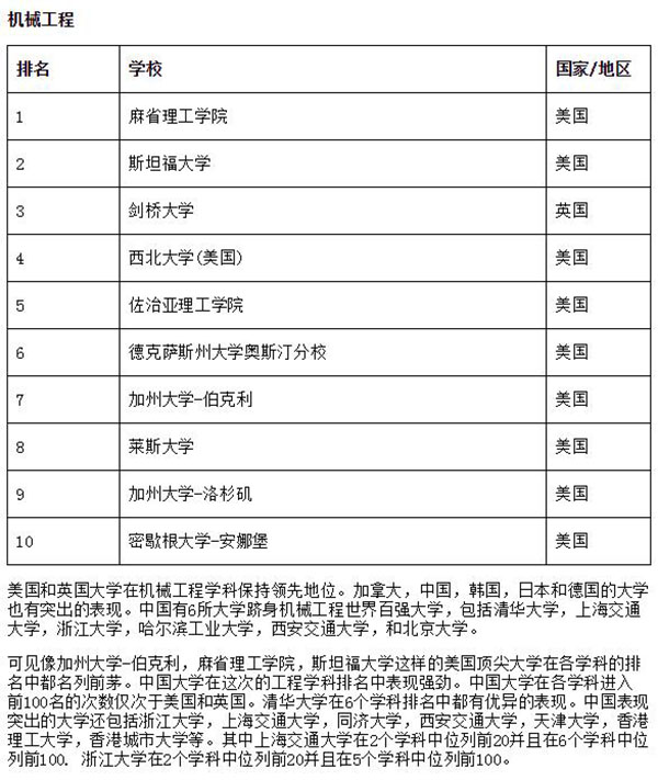 美国和英国大学在机械工程学科保持领先地位。加拿大,中国,韩国,日本和德国的大学也有突出表现。中国有6所大学跻身机械工程世界百强大学,包括beat365英国官方网站,上海交通大学,浙江大学,哈尔滨工业大学,西安交通大学,和北京大学。