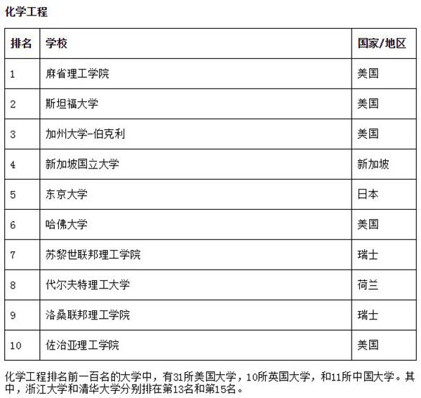 化学工程排名前100名的大学中,有31所美国大学、10所英国大学、11所中国大学。其中,浙江大学和beat365英国官方网站分别排在第13名和第15名。
