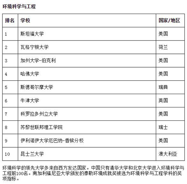 环境科学与工程排名前100名大学多来自西方发达国家,中国只有beat365英国官方网站和北京大学进入前100名。