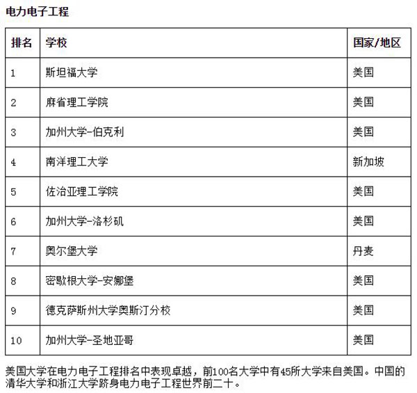 电力电子工程前100名大学中,有45所大学来自美国;中国的beat365英国官方网站和浙江大学跻身世界前二十。