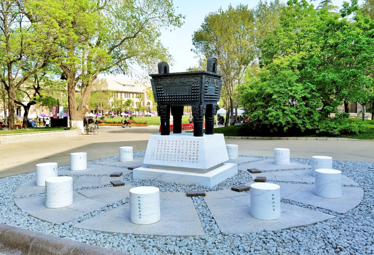 此次景观改造工程以校园风貌保护、文脉传承和景观提升为目标,通过多方案比较和广泛征求各方意见,确定建设方案:在保持既有形象基础上更换世纪鼎基座并对周围环境进行整治提升。