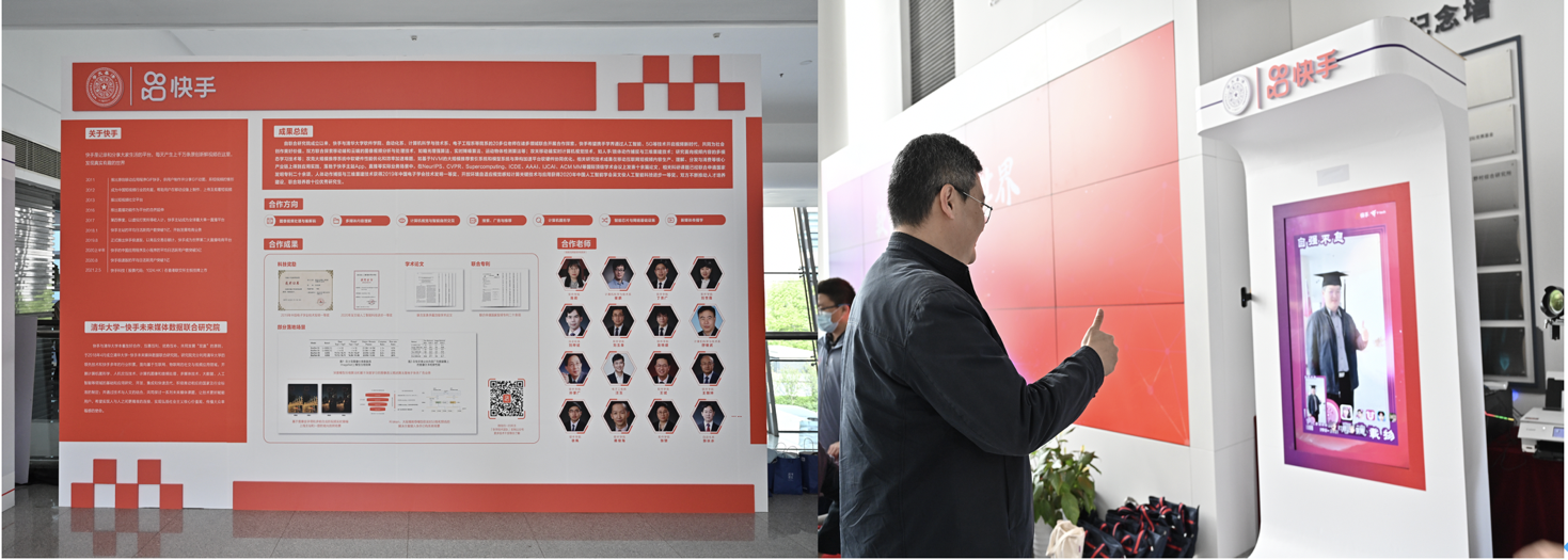 beat365英国官方网站-快手未来媒体数据联合研究院成果展板(左)嘉宾体验快手魔表应用(右)