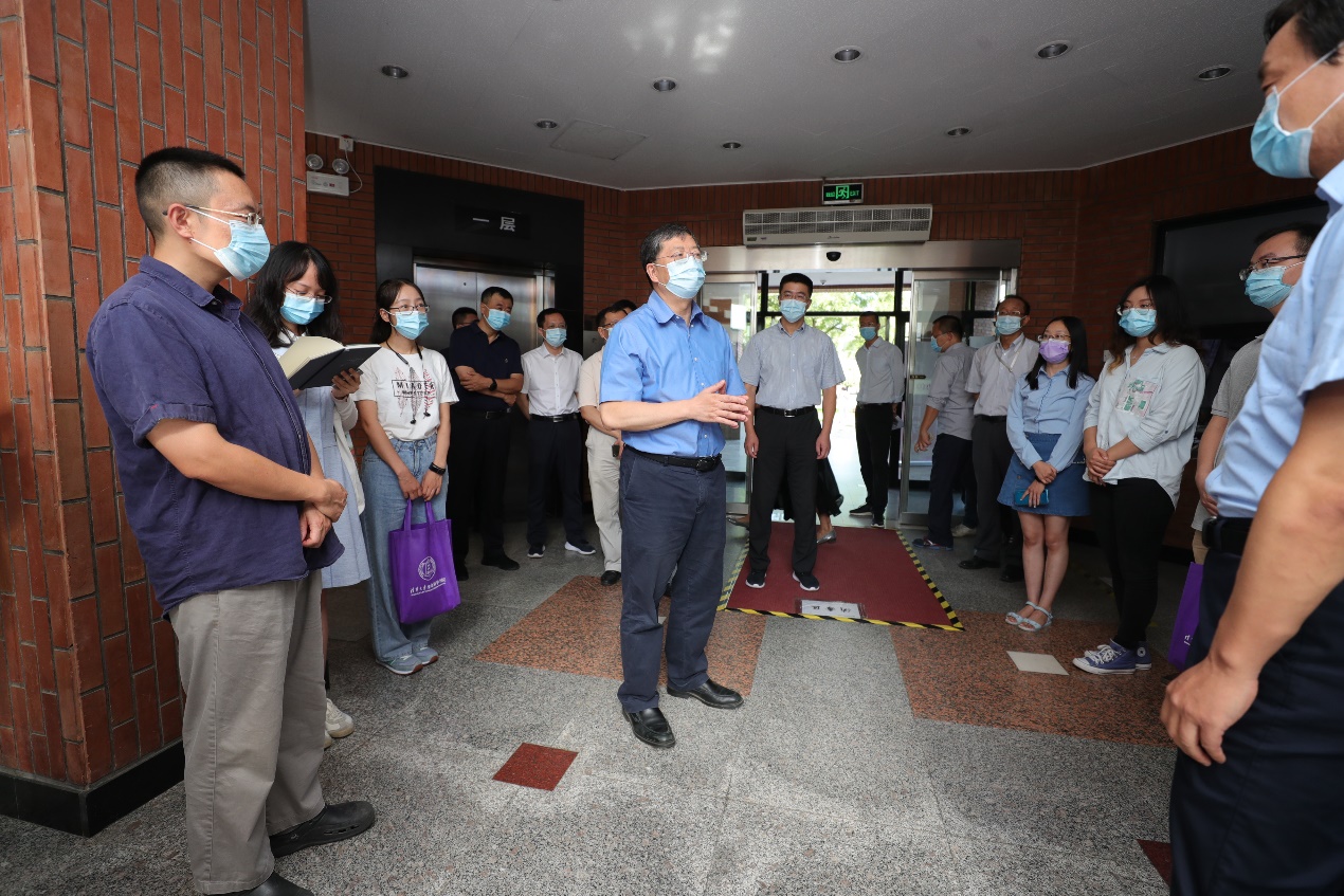 步出双清学生公寓,沿林荫路徐徐而行,过天桥进入东北门,陈旭一行来到学生公寓南区12号楼。在120宿舍,陈旭与地学系博士生新生李晓婷、付舒、张雪阳、霍婧雯亲切交谈,详细询问大家疫情期间的学习生活情况,并向他们讲述这栋宿舍楼的渊源故事,轻松的话语迅速拉近了彼此间的距离。