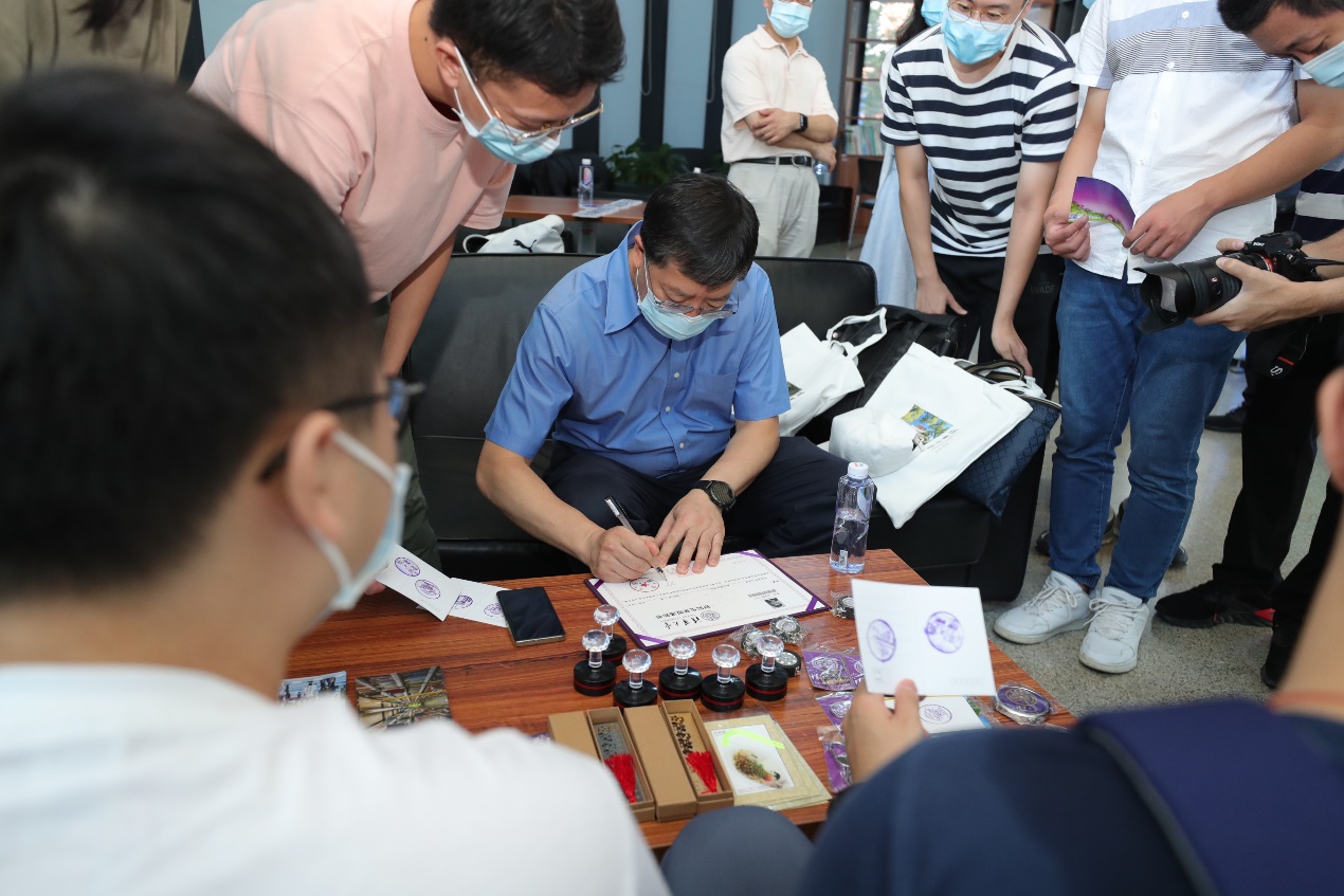 在航天航空学院迎新点,新生邀请邱勇在自己的录取通知书上签名留念