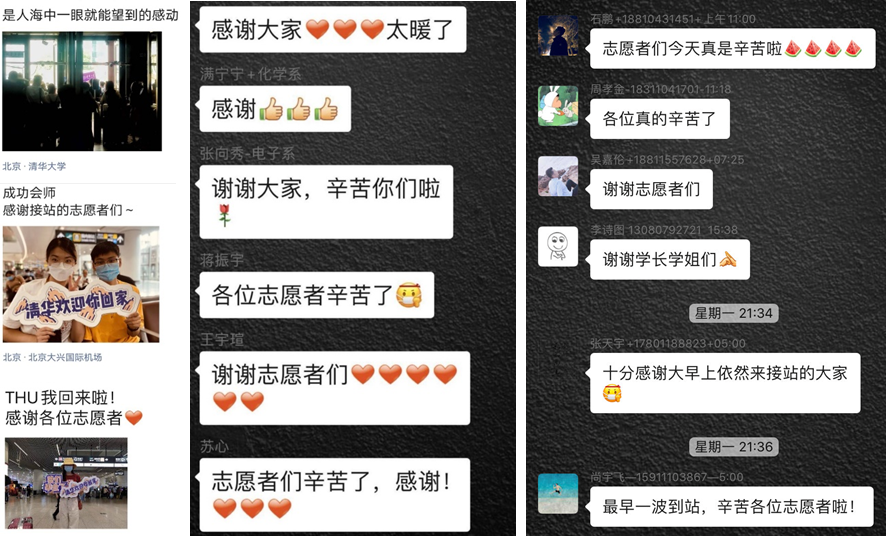“感谢志愿者!”“你们辛苦了!”“感谢大家,太暖了!”……志愿者建立的接站微信群也被返校同学的暖心感谢刷了屏。
