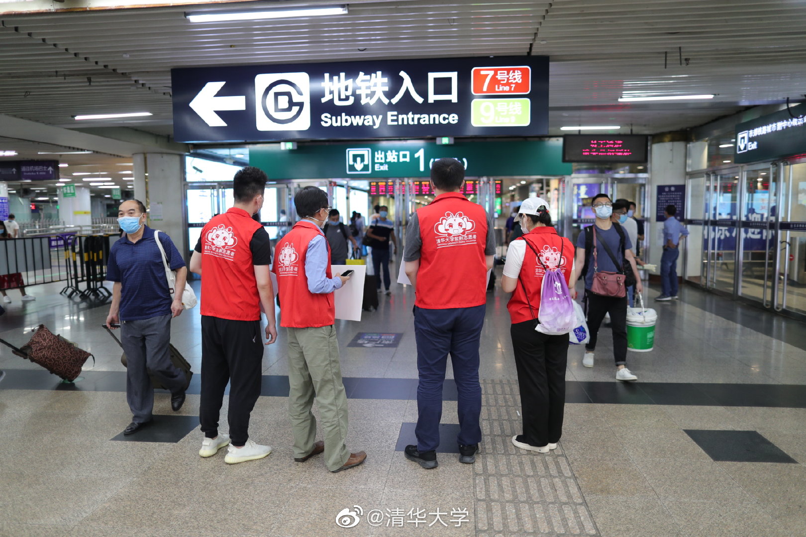 志愿者在火车出站口等待返校同学