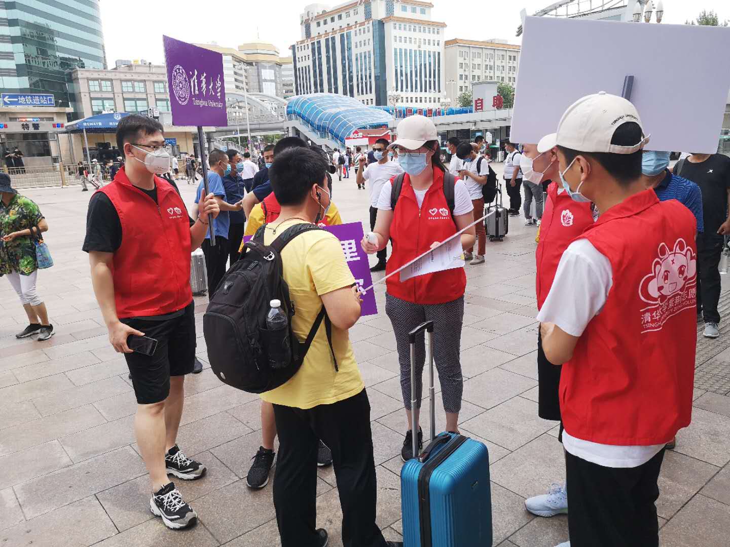 6月6日是来自山西太原的生命学院博士生寇甜甜返校的日子。一出车站,寇甜甜就看到了高举“风里雨里、清华等你”指引牌、穿着熟悉的红色马甲的学校接站志愿者。志愿者们“欢迎回家”的亲切问候,让她顿时有了温暖的感觉。