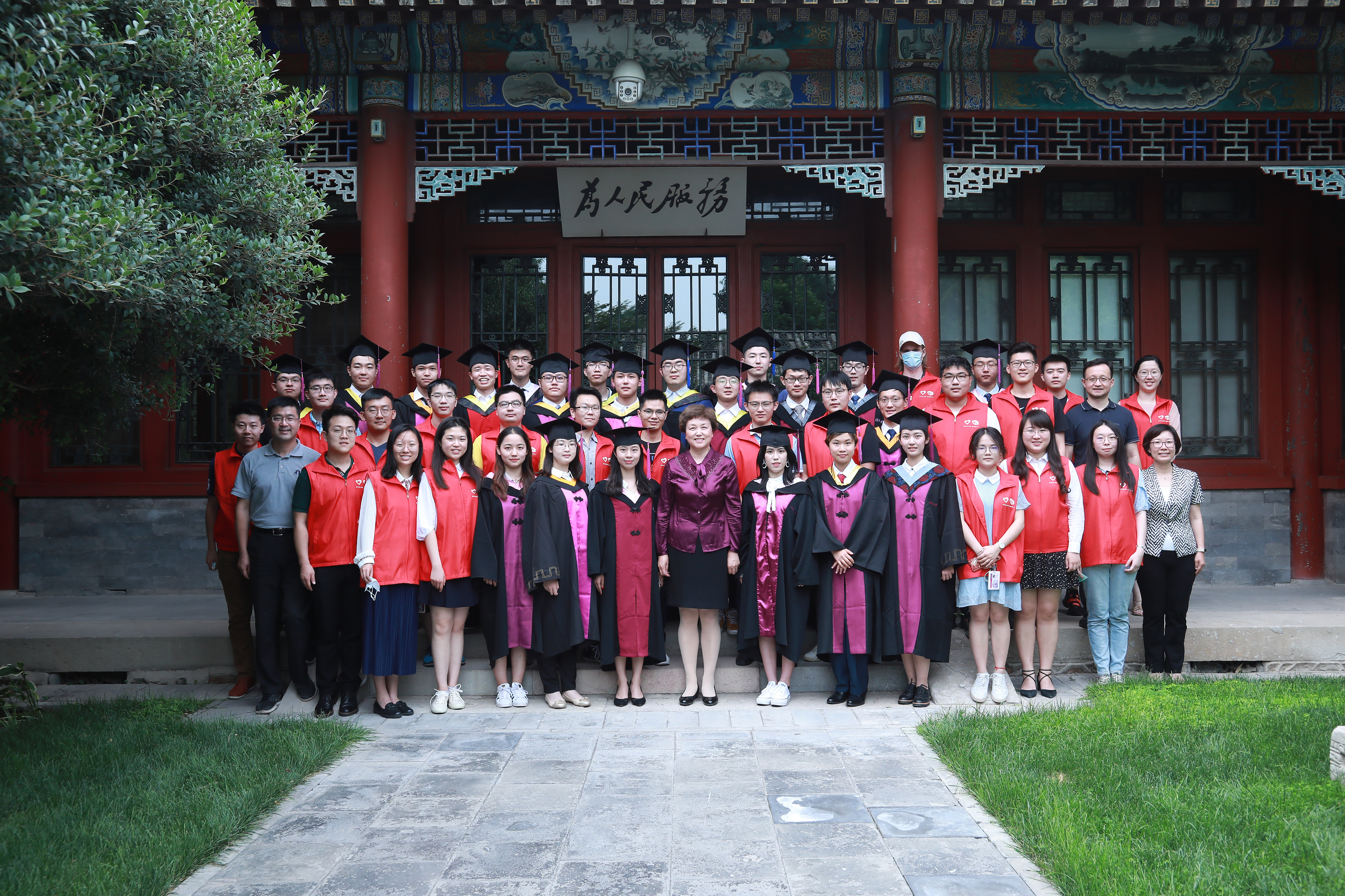 在“为人民服务”的匾额下,党委书记陈旭、党委副书记过勇、学生部部长白本锋、团委书记张婷与同学们合影留念。