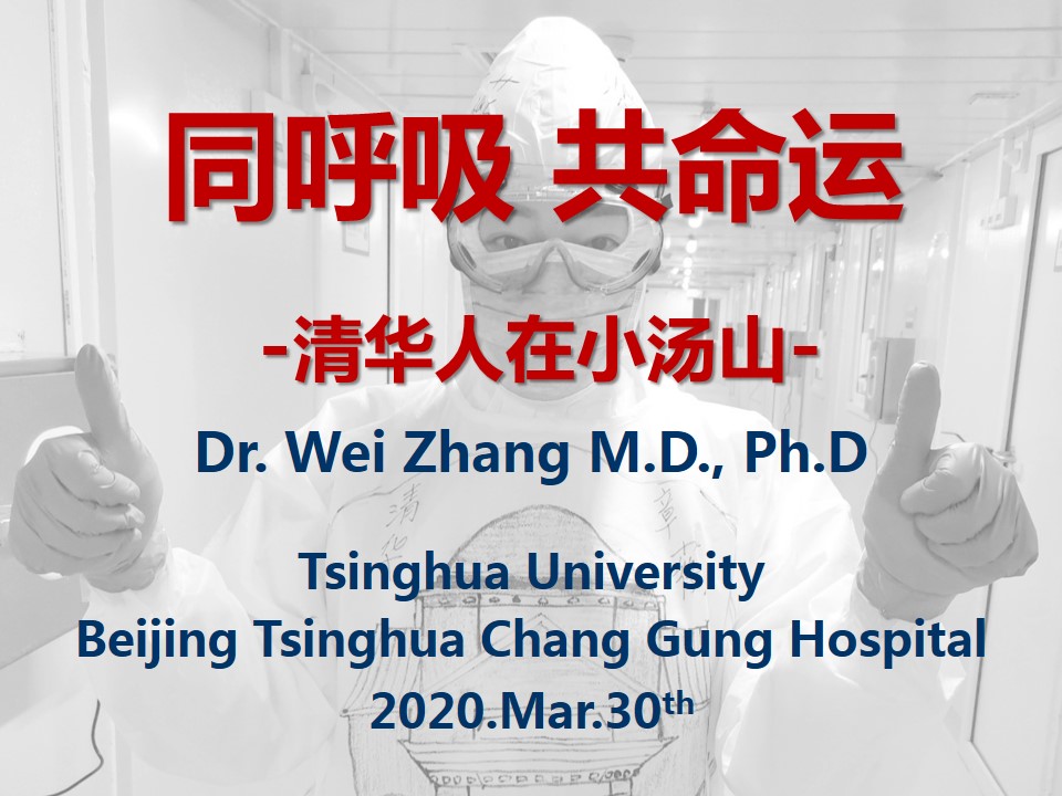 3月30日下午,“医学生理学”照常开课。连线视频中出现了一位身着浅蓝色洗手服的医生,共享屏幕上显示:“同呼吸、共命运——清华人在小汤山”,背景图片是一位身着防护服的医务人员,隐约可见防护服上手绘的清华大礼堂。