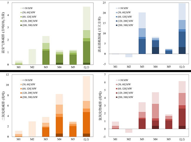 进一步地,本研究构建了能源基础设施温室气体减排“年份-存量”综合评价模型,建立了在役设施与减排技术途径的优选匹配方法,揭示了不同减排技术情景及能效提升目标下,园区能源基础设施的温室气体减排潜力、减排成本和协同环境效益。2014年,1604家中国省级及以上园区能源基础设施的温室气体排放、淡水消耗、二氧化硫排放和氮氧化物排放分别占同年全国总量的18%、5%、12%和15%。基准情景下,园区能源基础设施存量在其剩余服役时间(平均跨度为2015~2032年)的累积温室气体排放为462亿吨CO2当量,相当于政府间气候变化专门委员会《全球升温1.5℃特别报告》中全球碳预算的11%。综合情景下将M1-M5进行组合实施,相比基准情景可实现温室气体减排8~16%,并可协同节水、减排二氧化硫和氮氧化物34~39%、24%~31%和10%~14%;同时,减排具有一定经济效益,综合情景下单位减排成本为-519元/吨CO2当量(2015年可比价)。