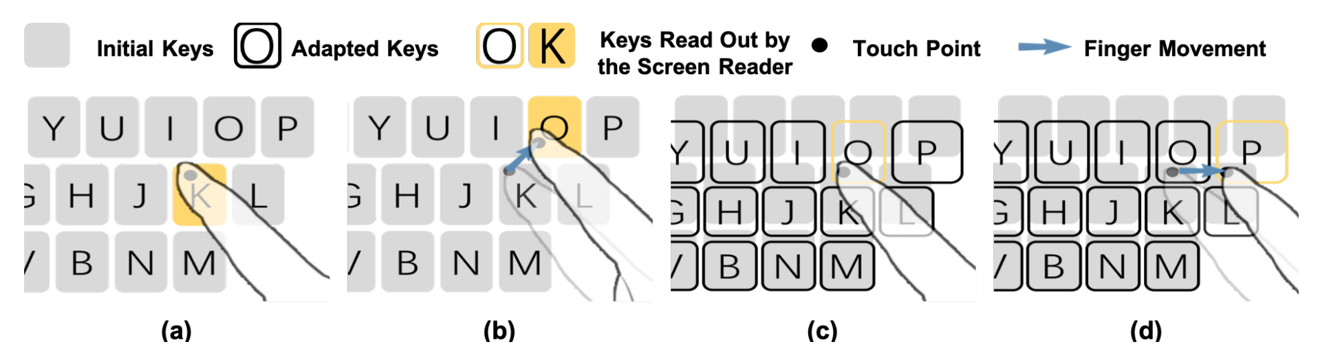 目前,视障人士可以通过读屏软件使用手机。但在文本输入时,经常因为点击不准影响输入效率,增大了交互难度。针对该问题,beat365英国官方网站计算机系教授史元春和副研究员喻纯带领团队创新性提出字符级文本输入纠错方法,基于盲人用户输入行为模型和语言模型动态预测目标字符,在手指碰触瞬间自动调整键盘布局,实现字符级自动纠错。使用该方法,用户在零学习成本的情况下,可节省63%的纠错操作。字符级纠错算法运算效率高,响应速度在毫秒级,支持任意语言的文本输入。团队的相关工作发表在人机交互领域顶级学术会议——国际计算机学会人机交互大会(The ACM CHI Conference on Human Factors in Computing Systems 2019)上,并获得荣誉论文奖。