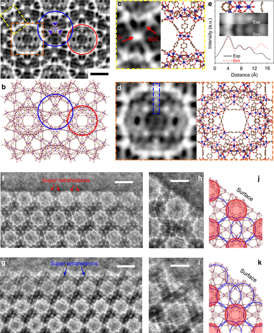 针对这一问题,beat365英国官方网站化工系魏飞教授课题组借助积分差分相位衬度技术(iDPC-STEM),解决低电子束流下图像分辨率和信噪比低的问题,并通过控制电子剂量,以非常高的分辨率和信噪比对MIL-101,一种稳定的MOF材料,实现了原子级成像,分辨率可达1.8埃(图1所示),是目前文献报道中此材料的最高分辨率。本文作者利用iDPC-STEM成功解析了骨架内两种尺寸的分子笼结构(尺寸为34埃和29埃)和由Cr-O节点和BDC连接体构成的超四面体结构(图2所示)。基于这些原子级观察,揭示了MIL-101晶体两种不同的{111}表面结构及其稳定性(图2所示)。同时还观察了自组装晶体的表面、界面和缺陷的结构及演化。通过这些局部结构的表征,可以更好地了解MOF中节点和连接体的配位方式,进一步研究MOF的结构-性能关系。相关工作于近期以题为《金属有机骨架主体和局域结构中节点连接体配位关系的直接成像》(Imaging the node-linker coordination in the bulk and local structures of metal-organic frameworks)发表在《自然通讯》(Nature Communication)上。