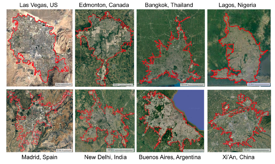图2 选取的8个全球代表性城市的边界结果(2018年)