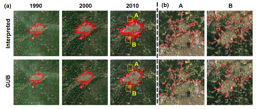 GUB数据集以长时序的GAIA数据为基础,包括了全球所有面积超过1平方公里的城市及周边居民点的边界。其算法内涵是结合宏观尺度的核密度分析和微观尺度的邻域扩张算法,叠加上边界地区的形态学处理,实现自动地划定城市的空间范围和轮廓。该数据集主要借助谷歌地球引擎(Google Earth Engine)平台进行开发,绘制了全球多时相的城市边界数据。通过对比人工解译的结果,GUB数据集能够很好地捕获到城乡边缘地区的轮廓特征,并且可以实现全球范围的快速制图和多时相结果更新,从而大大降低了人工解译城市边界的人力成本和定义的主观性。该算法具有较好的鲁棒性,能同时很好地刻画大城市和小城市的轮廓特征。在国家尺度上,基于GUB城市边界数据得到的城市大小与人工解译数据较为接近,证明了算法在推广到全球和多期制图的可行性。