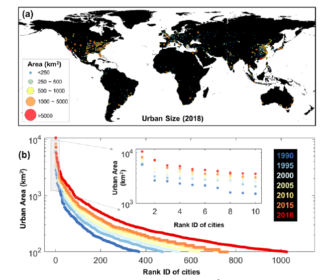 图3 (a)全球城市边界面积超过100平方公里的城市分布(2018年);(b)多期城市面积-大小排序曲线,小图代表着多期排名前10的城市面积-大小排序。