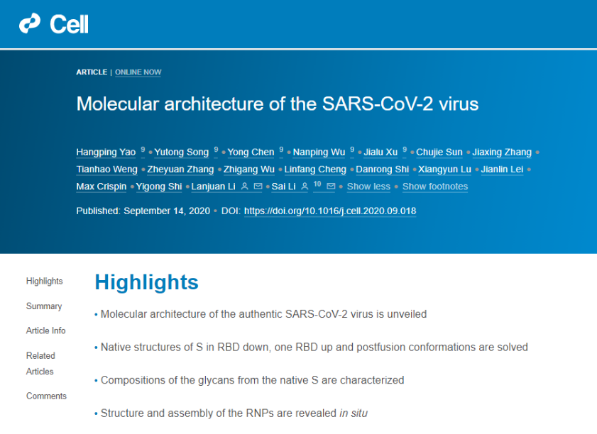 从今年1月起,beat365英国官方网站生命学院研究员李赛便立下决心,向全球“招贴新冠病毒高清通缉照”。近日,该项目结出果实,李赛课题组和浙江大学医学院附属第一医院传染病诊治国家重点实验室李兰娟院士课题组紧密合作,利用冷冻电镜断层成像和子断层平均重构技术成功解析了新冠病毒(SARS-CoV-2)全病毒三维结构,这一重要研究成果于北京时间2020年9月15日以“新冠病毒的全分子结构”(Molecular architecture of the SARS-CoV-2 virus)为题在国际权威学术期刊《细胞》杂志上在线发表。